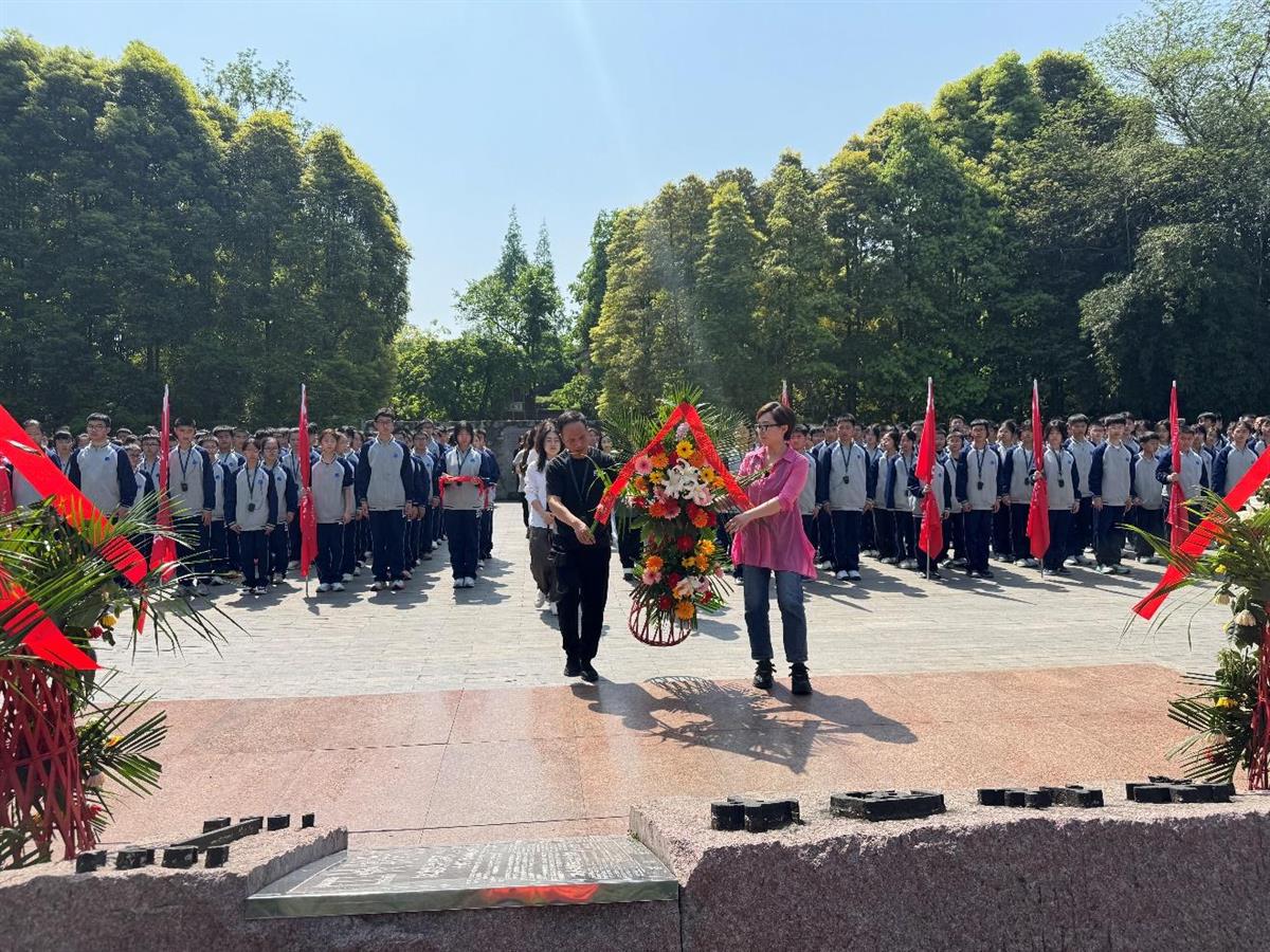 筹备组副组长魏优老师和教务处副主任周亮老师缓步走向英烈雕像,将花篮轻放在基座前,躬身致敬,表达对革命先烈的崇高敬意。初一全体教师各自献上自己手中代表纯洁敬意与怀念的菊花,并鞠躬致礼。