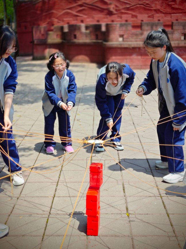 在老师的组织下,各班积极参加鼓面接网球和绳索吊积木的拓展活动,同学们在反复尝试中逐渐形成默契,从最初的慌乱到有序配合,再到最终完成挑战,孩子们体验到了团结协作的胜利成果,更进行了“军民团结抵御外敌”和“高楼象征民族复兴,需代代接力”的深刻思考。