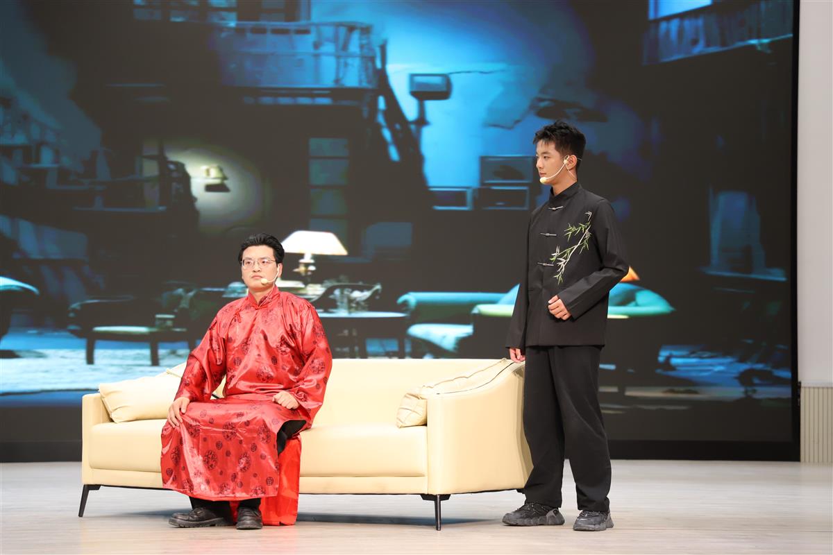 以“雷雨夜”为背景,周公馆的家族矛盾在伪善家长周朴园(音乐教师秦明明饰)、意外归来的鲁侍萍(2024级6班张桂嘉)、抗争者鲁大海(2024级4班兰天)等角色的交锋中层层激化。师生同台竞技,张力十足,将压抑、冲突与人性挣扎展现得淋漓尽致,再现了曹禺笔下风雨欲来的戏剧高潮。