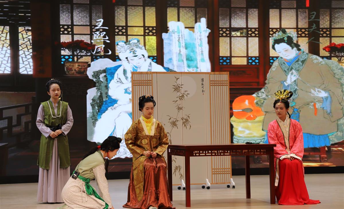 聚焦“抄检大观园”经典场景,学生通过细腻的舞台调度与情感表达,演绎了封建礼教下诗意孤岛的崩塌。邢夫人(2024级2班况亭萱)借绣春囊发难、王夫人(2024级2班陈乐言)执灯抄检的片段,以昏黄光影与血色意象,暗喻群芳凋零的悲剧命运,引发观众对文学深意的思考。